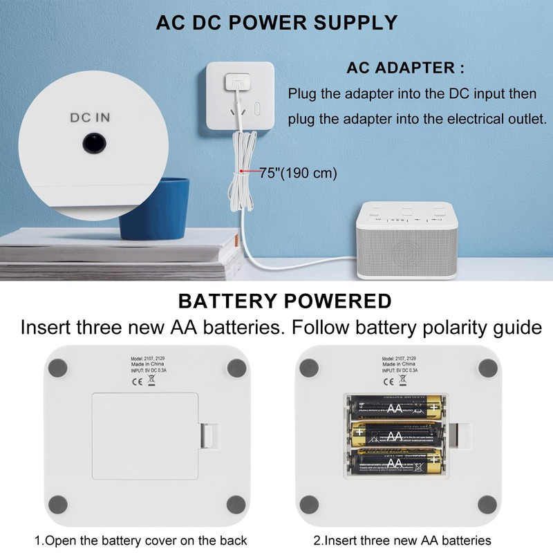 - 【 Dual Power Mode 】 - The white noise sleep instrument is powered by two different modes: AC adapter (included) or 3 AA batteries (not included). It can be used for travel, camping, working from home, anytime, anywhere, providing peaceful sleep assistance without worrying.
