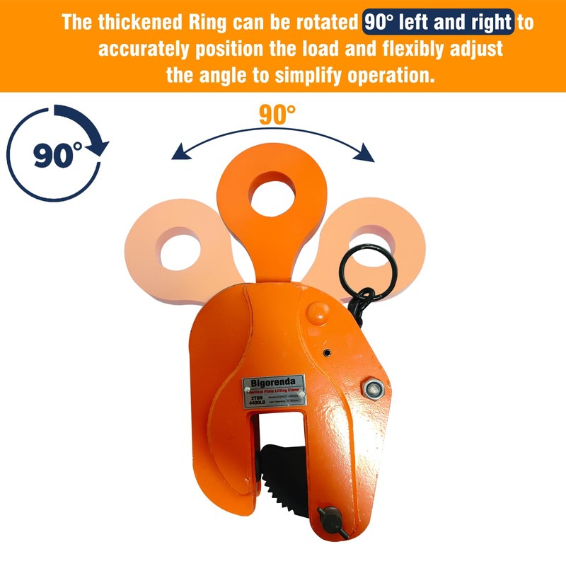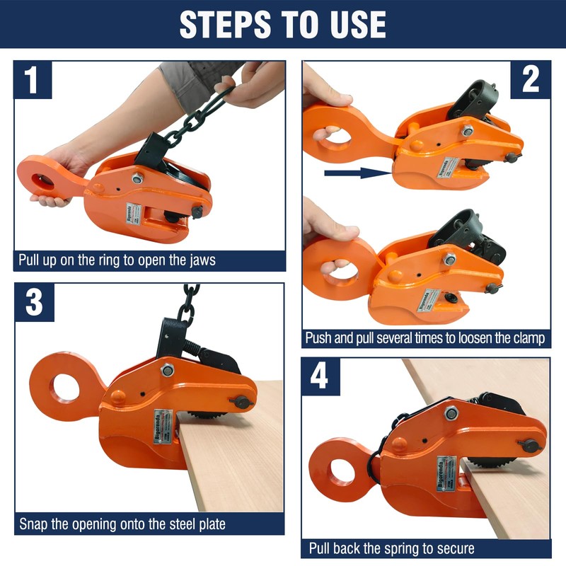 - 【Easy to Operate 】The vertical plate clamp lifting is easy to operate. Pull the ring to open the clamp, release the clamp with a hook, clamp the steel plate into the opening, and then pull back the spring to lock it. It can ensure that the heavy duty vertical plate lifting clamp will not slide when lifting or lowering the load.