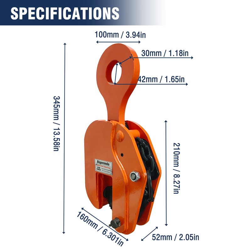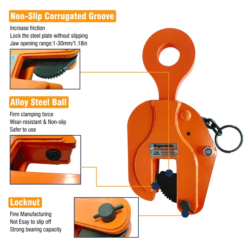 - 【Specification】4410LBS capacity and flexible lifting clamps vertical; 4410LBS/2T workload limit; The opening range is 0 to 30mm (1.18 inches). Suitable for heavy-duty lifting or transportation of steel and metal plates. The overall structural design is compact, allowing for In a compact environment and retrieval of items in small environments, saving space and time.