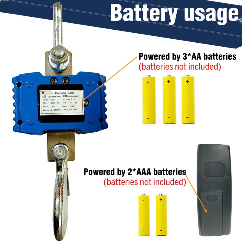 - 【Multi-Function】Digital hanging scale supports HOLD, ZERO, TARE, unit Kg/Lb switching, Equipped with remote control, can be controlled from 3 metres away. You can control it from a distance even if the scale is hanging high up. Weighing at height just got easier. Whether high or low, you are always in control! The AA battery supplies power to the crane scale, while the AAA battery ensures smooth operation of the remote control. Both batteries are standard 1.5V and are not included.