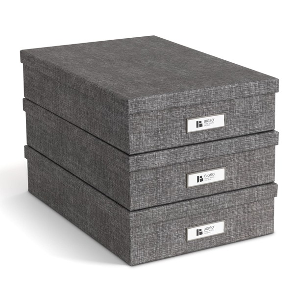 Bigso Oskar Canvas Fiberboard Document Letter Box for Important Paperwork A4 or Letter Size - Durable Keepsake Box with Lid and Metal Label Holder - 3.3in x 10.2in x 13.8in - Melange Grey - 3 Pack