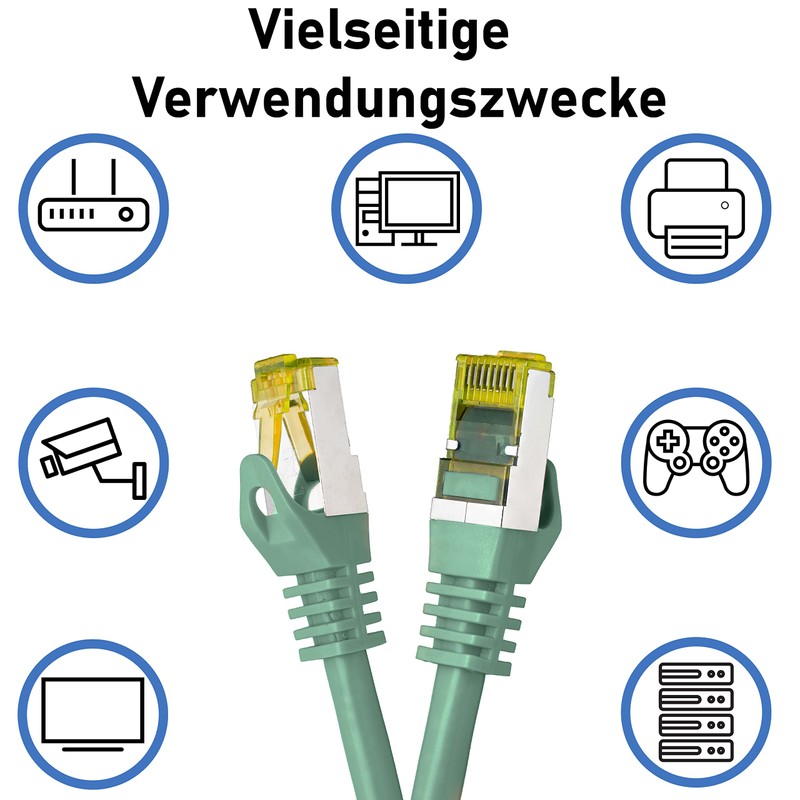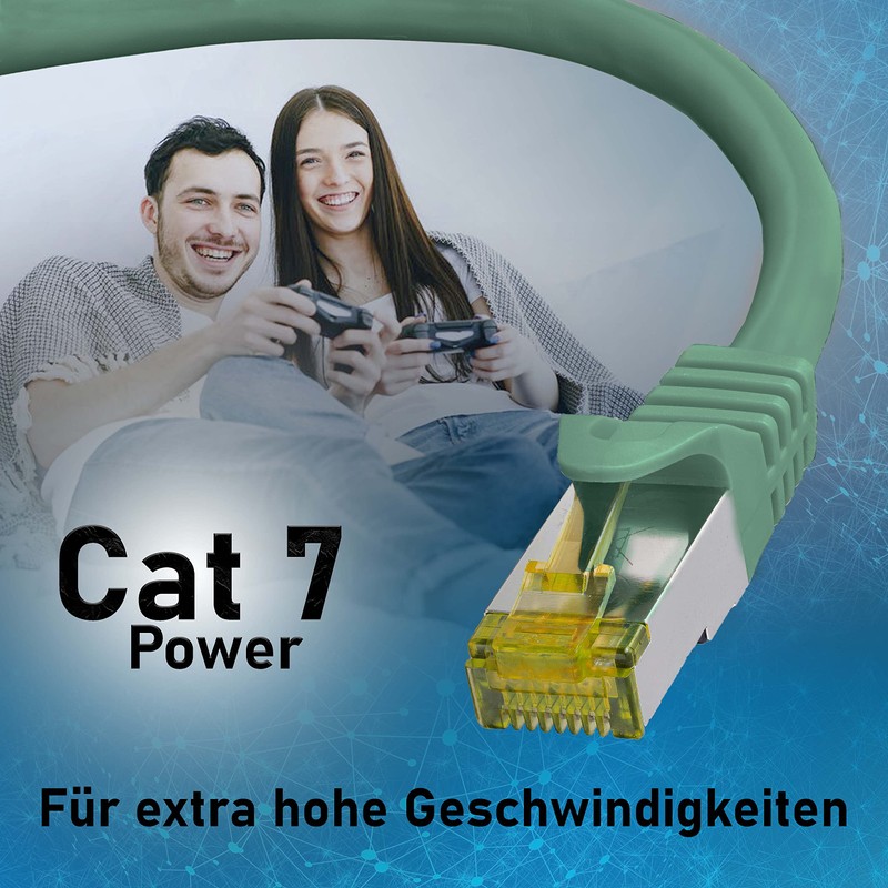 - LAN cable CAT7 S/FTP, double shielded network cable, shielded RJ45 plug, gold-plated pins, latch protection, fully assigned 8-core RJ45 cable