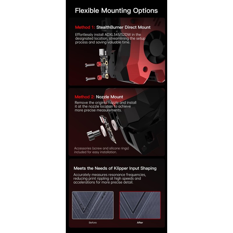 - ★Flexible Mounting Options : Method 1: StealthBurner Direct Mount- Effortlessly install ADXL345 in the designated location, streamlining the setup process and saving valuable time; Method 2: Nozzle Mount- Attach near the nozzle for precise measurements