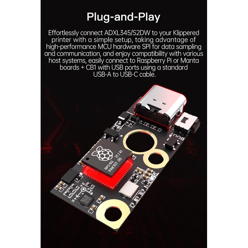 - ★Plug-and-Play: Effortlessly connect ADXL345 to your Klippered printer with a simple setup, taking advantage of high-performance MCU hardware SPI for data sampling and communication, and enjoy compatibility with various host systems, easily connect to Raspberry Pi or Manta boards + CB1 with USB ports using a standard USB-A to USB-C cable.