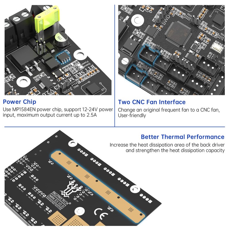 - ✔More safety designs: to print safely, SKR MINI E3 TMC2209 driver with excellent heat dissipation. At the same time, increase the protection circuit of the heating rod MOS pipe, if the main control chip is damaged or the MOS pipe of the heating rod is damaged, the power supply of the heating rod can be interrupted in time.