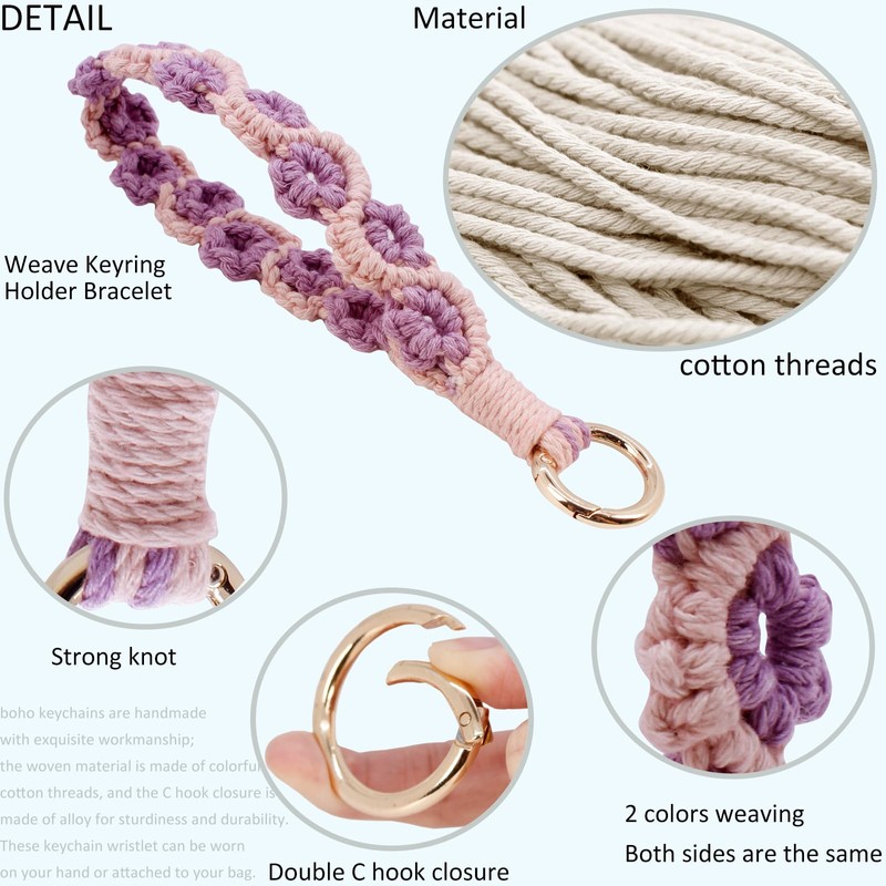 - Bobo macrame keychain: Wristlet bracelet keychain is made in bohemian weave style with beautiful floral patterns woven with cotton thread to add exotic style,these boho keychain is handmade with exquisite workmanship.Lightweight and soft, easy to carry.