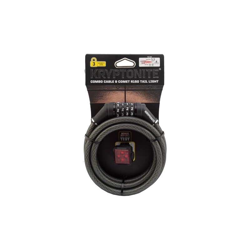 Secure your bicycle without sacrificing convenience or visibility with the Kryptonite Cable Lock w/Comet Combo. This product combines a strong, reliable cable lock with a bright rear light, making it an excellent choice for cyclists who need practical security solutions. Why Choose the Kryptonite Cable Lock w/Comet Combo? Dual Functionality: Not just a lock, but also a safety device. The R150 Comet tail light provides significant visibility improvements, crucial for evening or early morning rides. Convenient Security: The combination lock offers an easy-to-use, key-free security option, allowing you to set and reset your own code as needed. This feature is particularly beneficial for young riders or those with multiple users needing access. Suitable for Various Settings: While it’s perfect for low-risk areas, the versatility and ease of use make this lock suitable for school, local commutes, or quick stops. Built to Last: The cable’s robust construction ensures durability, while the protective coating guards against weather and wear, prolonging the life of your lock. Portable and Lightweight: Easy to carry and store when not in use, making it ideal for cyclists on the go. Whether you’re heading to the park, school, or just around the neighborhood, the Kryptonite Cable Lock w/Comet Combo provides the security and visibility you need. Embrace the convenience of a combination lock paired with the safety of a tail light in one efficient package. Equip your bike with this essential accessory today and enjoy a worry-free riding experience.