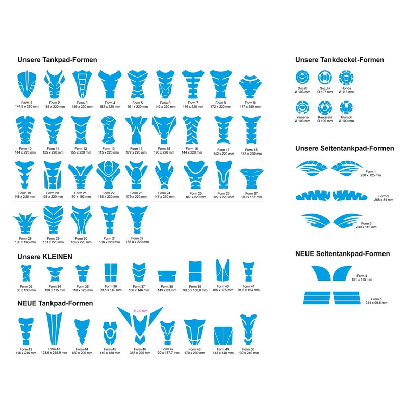 With this offer you will receive a universal 3D tank pad. Suitable for Yamaha, Honda, Ducati, Suzuki, Kawasaki, KTM, BMW, Triumph and Aprilia tanks. The tank pad has a width of 19 cm and a height of 22 cm. Please compare the size dimensions with your machine. Our 3D pads are printed on high-quality film in 4C digital print and then coated with our doming resin. The films are designed for long-term outdoor use and equipped with a particularly strong adhesive, so that the pads have an extreme adhesive power.