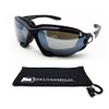 - BUILT FOR MOTORCYCLE RIDING: There’s nothing more important than protecting your eyes while you ride. These motorcycle glasses wrap 180 degrees to stay on your head at high speeds without wiggling. Built in sweat proof foam cushion will block out wind, dust and debris; as well as provide a nice snug fit. Shatterproof Impact Resistant Polycarbonate lenses stands up to bugs, debris and flying rocks.