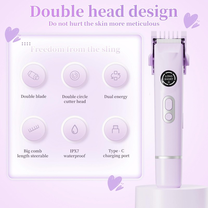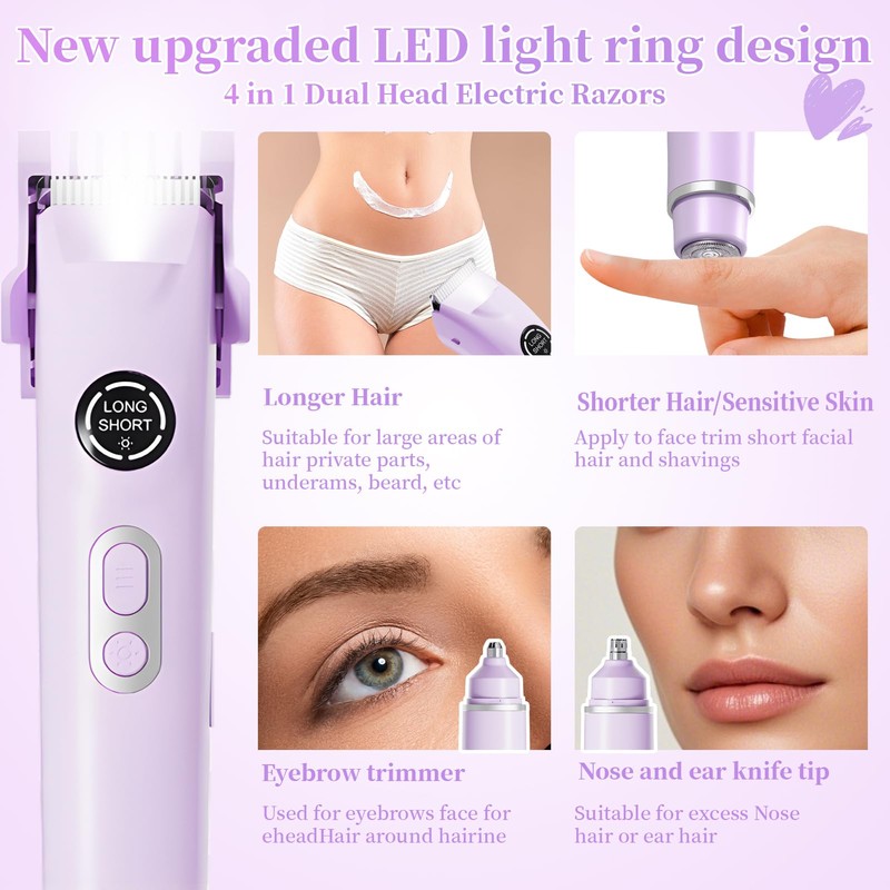- 4-in-1 Bikini Trimmer : This multi-functional electric shaver is designed for women who want a complete hair removal solution without the clutter of multiple tools. With three interchangeable heads,a facial hair removal head, Eyebrow trimmer, and exclusively adopts clipper , it effortlessly handles hair on the bikini line, body, arms, legs, and delicate facial areas like lips and cheeks.