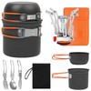 - Camping tableware set: 8-piece camping cookware set with 1 x camping pots, 1 x pans, 1 x cutlery set (3 pieces), 1 x cleaning cloth, 1 x storage mesh bag. Stainless steel pots + camping stove tableware set. Enjoy cooking with family and friends anywhere.