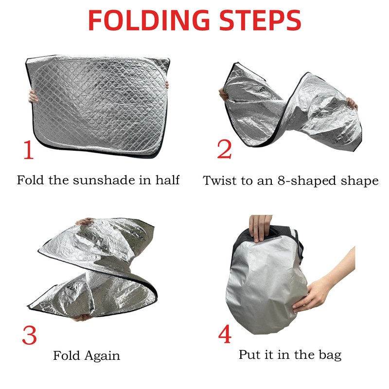 • Specifications and dimensions: Foldable sunshade window protector are light in weight and made of 240T fabric with higher density. When installing, you can pop the sunshade onto the windshield, and then roll them around. When installing, you can pop the sunshade onto the windshield, and then roll them around