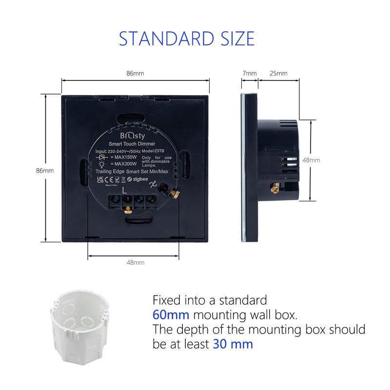 - ADVANCED DIMMING CONTROL: Supports trailing edge dimming for smooth, flicker-free light adjustment. Customize minimum and maximum brightness levels, as well as dimming speed, to suit your lighting preferences. Operation: Touch the circular area and release quickly to turn on/off. Touch the “➕” button to brighten and the “➖” button to dim. The dimmer switch features a memory function that remembers and restores the last brightness setting used