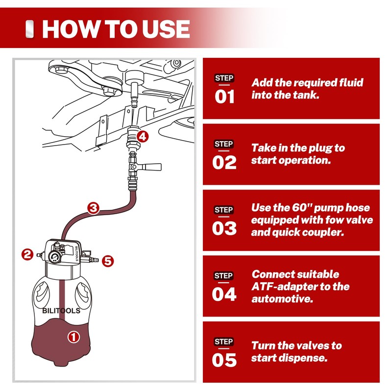 - Set includes: Pneumatic transmission fluid pump, all-metal 15pcs ATF filler adapters, 1x 60 inch main hose with control valve and quick-connector, 1x 39 inch flexible clear silicone hose (?6mm), 2x 39 inch semi rigid nylon tube (?8mm, ?10mm), 1x 39 inch Brake bleeding hose.