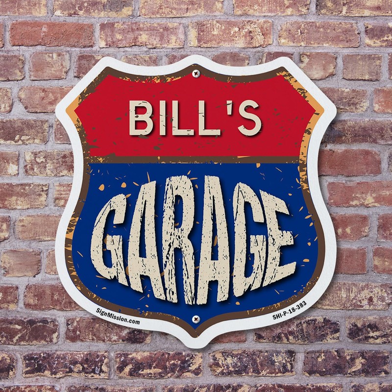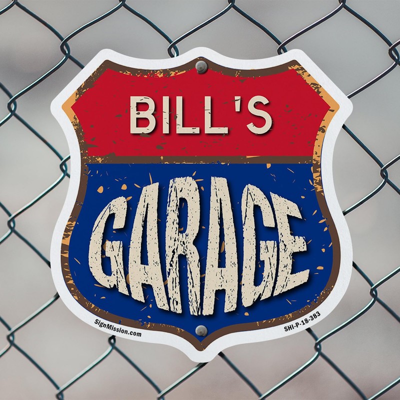 Bill's Garage 12 inch X 12 inch Shield Shaped Commercial Grade Plastic Sign Weather Resistant, UV Protected To last, Gift for Dads and Uncles Classic Americana Crafted in the USA