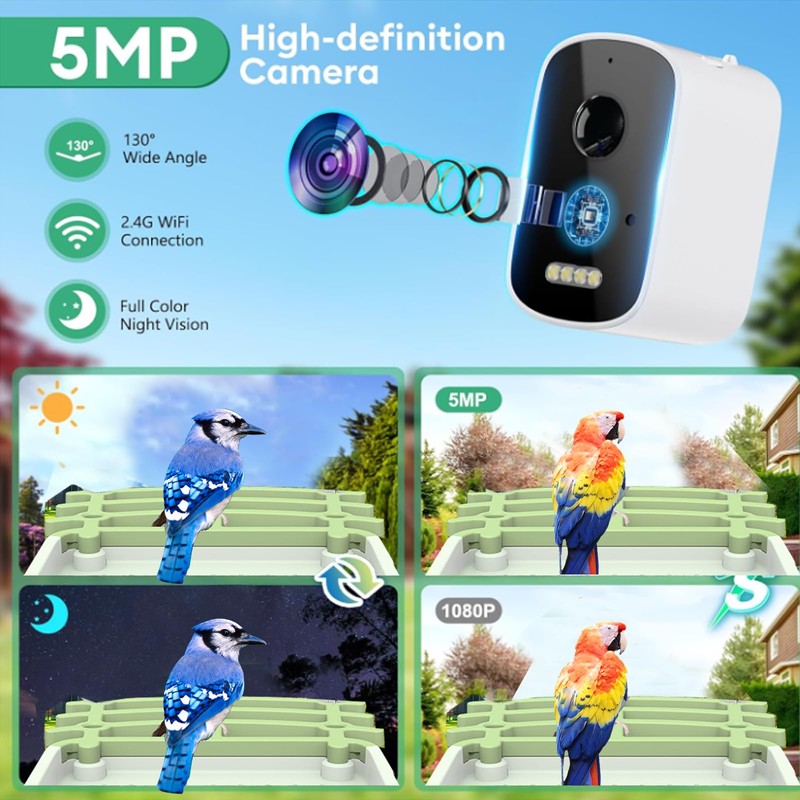 - Solar-Powered & Hassle-Free Operation Equip solar panels and a 4000mAh battery for non-stop power, even with heavy use. The 5dB antenna ensures stable 2.4GHz WiFi connectivity, so you’ll never lose signal or miss a bird’s visit. No wires, no charging stress—just seamless, solar-powered birdwatching joy!