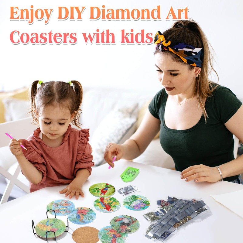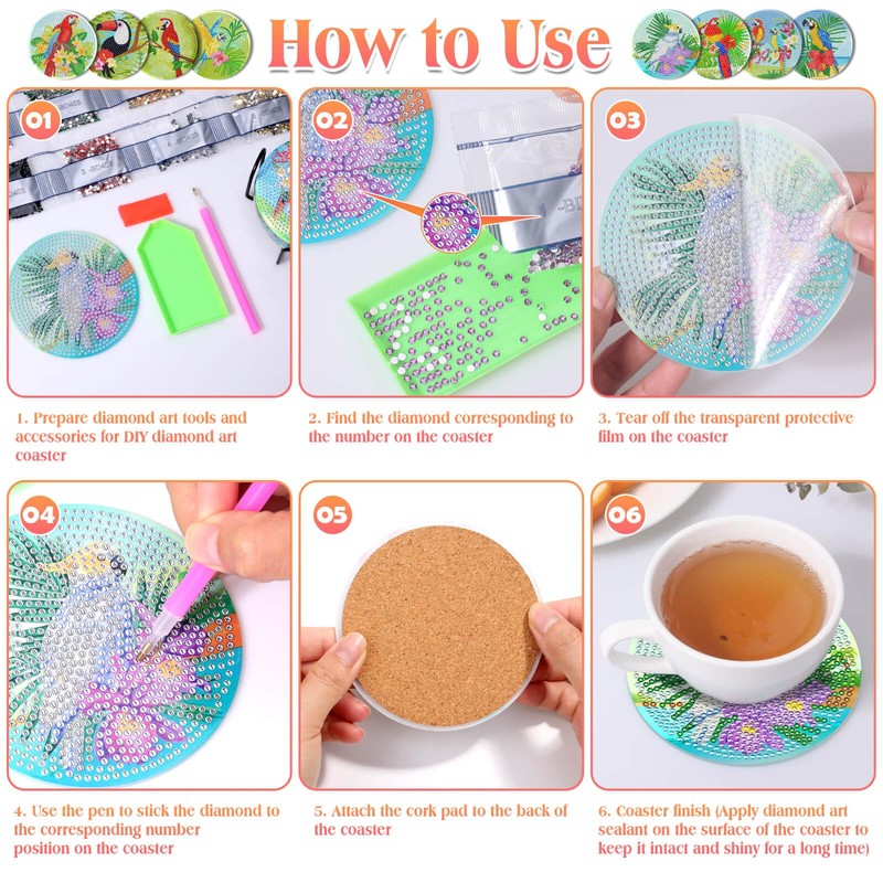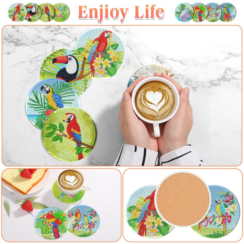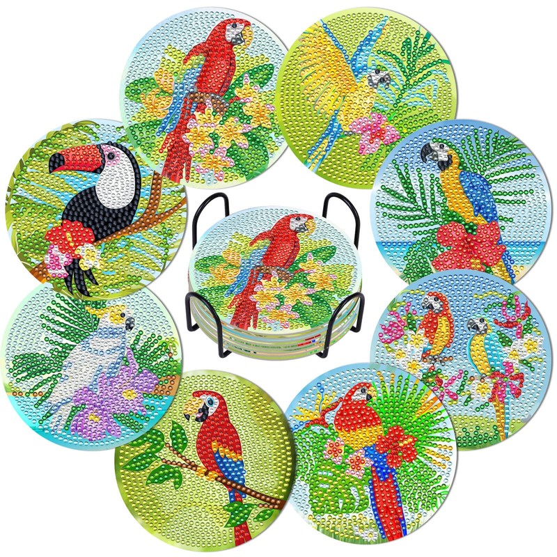 - Package Include: You will get 8 pieces diamond art painting coasters in parrots themed, 8 pieces stickable cork bases, 1 pieces coaster holder, 1 pieces colorful diamonds set, 1 pieces clay glue, 1 pieces diamond art pen, 1 pieces diamond tray, contains all the accessories and tools you need for DIY diamond art painting coasters