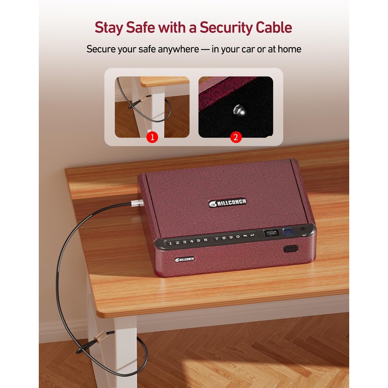 BILLCONCH Smart Gun Safe with Security Cable - Biometric Gun Safe for Handgun 4 Ways Quick Access with Fingerprint/Keypad/Key/APP Lock for Bedside Home Car with LCD/Voice Guide - Burgundy Red