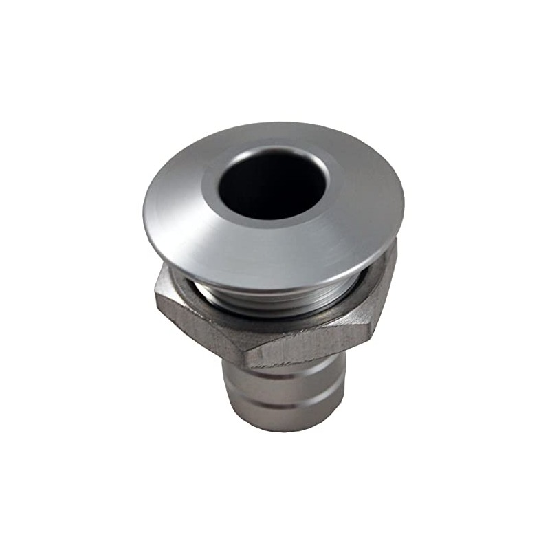 Blowsion machined aluminum bilge fittings are a clean replacement of the bulky plastic fittings usually supplied with aftermarket bilge pump kits. These fittings have a 3/4 inch hose barb flange machined on them so no hose clamp is necessary. ·Hose Barb Diameter (O.D.):3/4 inch. ·Thread Length: 1/2 inch. ·Nut Width: 1.25 inch.