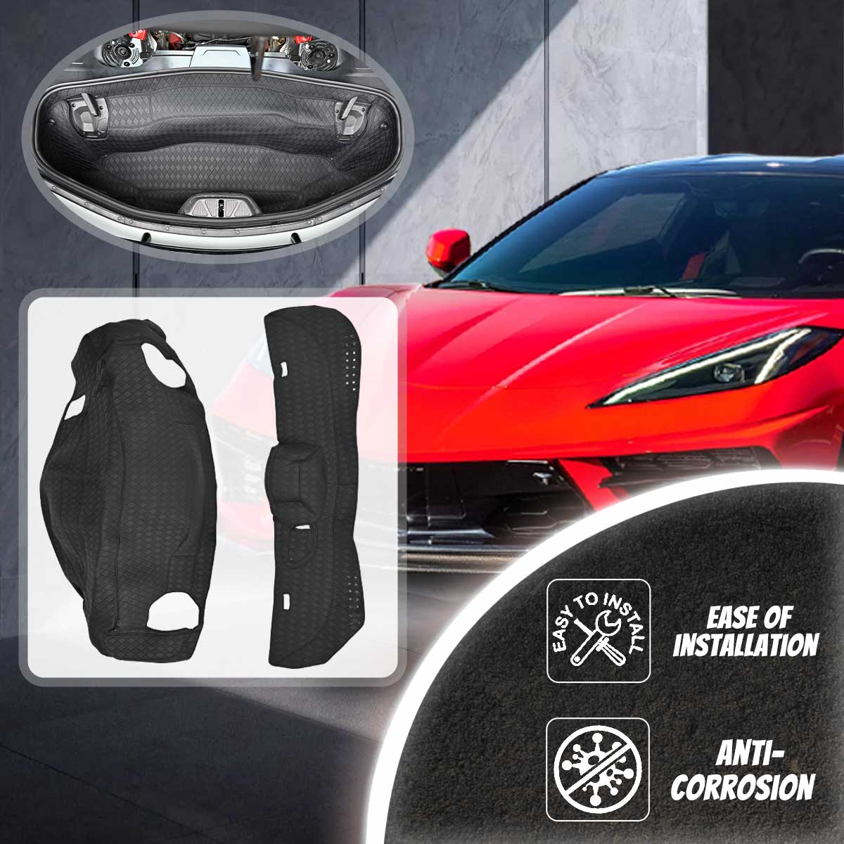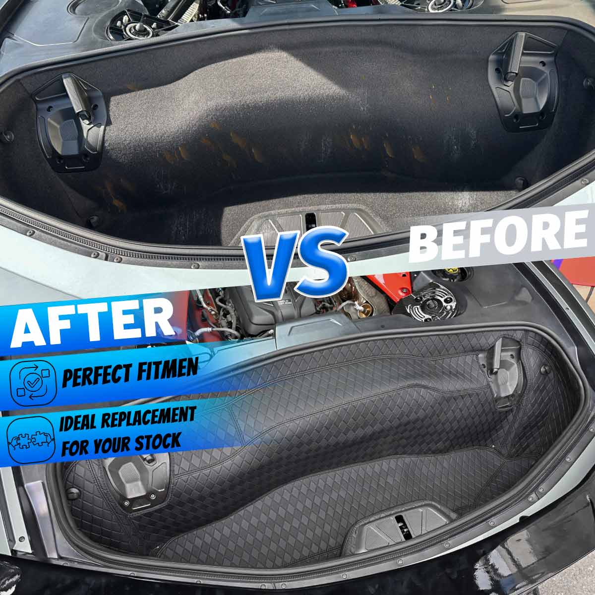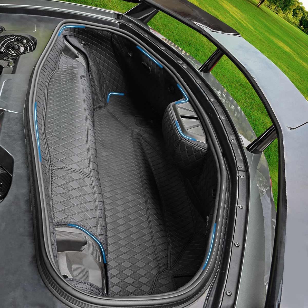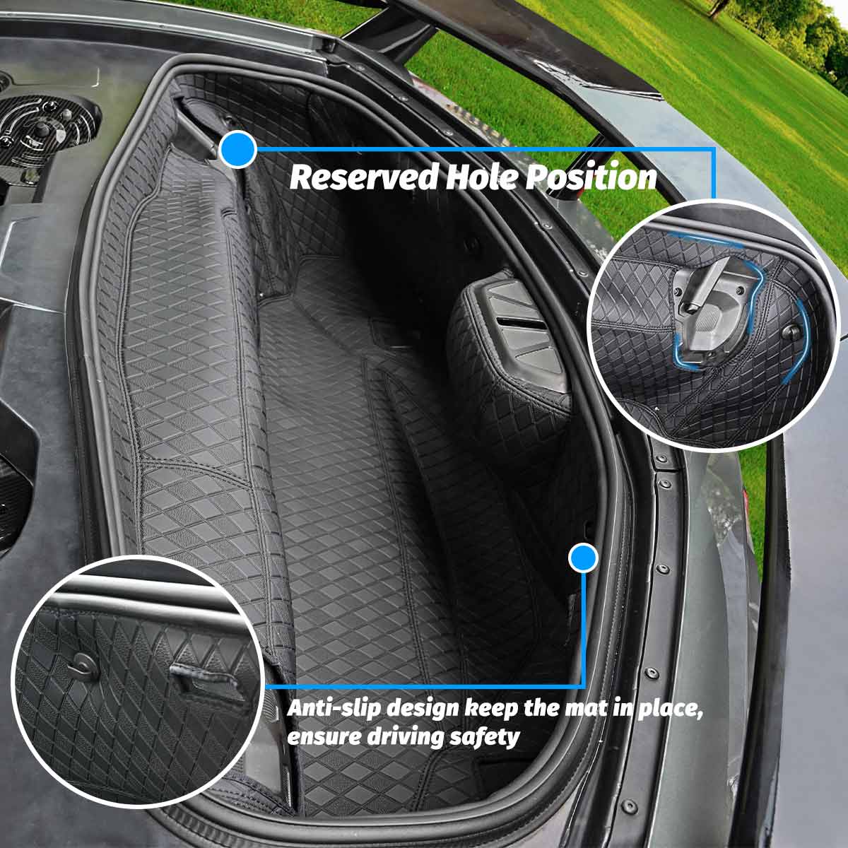 • The rear trunk mats for Corvette save you time vacuuming the C8 Highland and dry quickly after rinsing. Reinforced back bone grip nicely and fit the car snugly, so there's no need to worry about sliding when your car turn sharply,easy to clean,the unique superb craftwork and out-looking liner design with superb skills. This trunk mat is easy to decontaminate to clean and small dust can be wiped with towel, while clay can be washed with a high water gun.