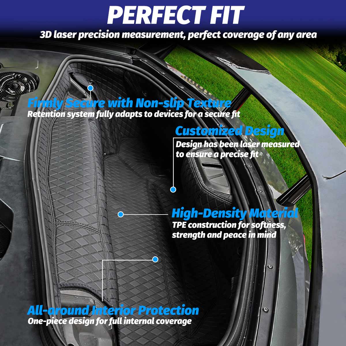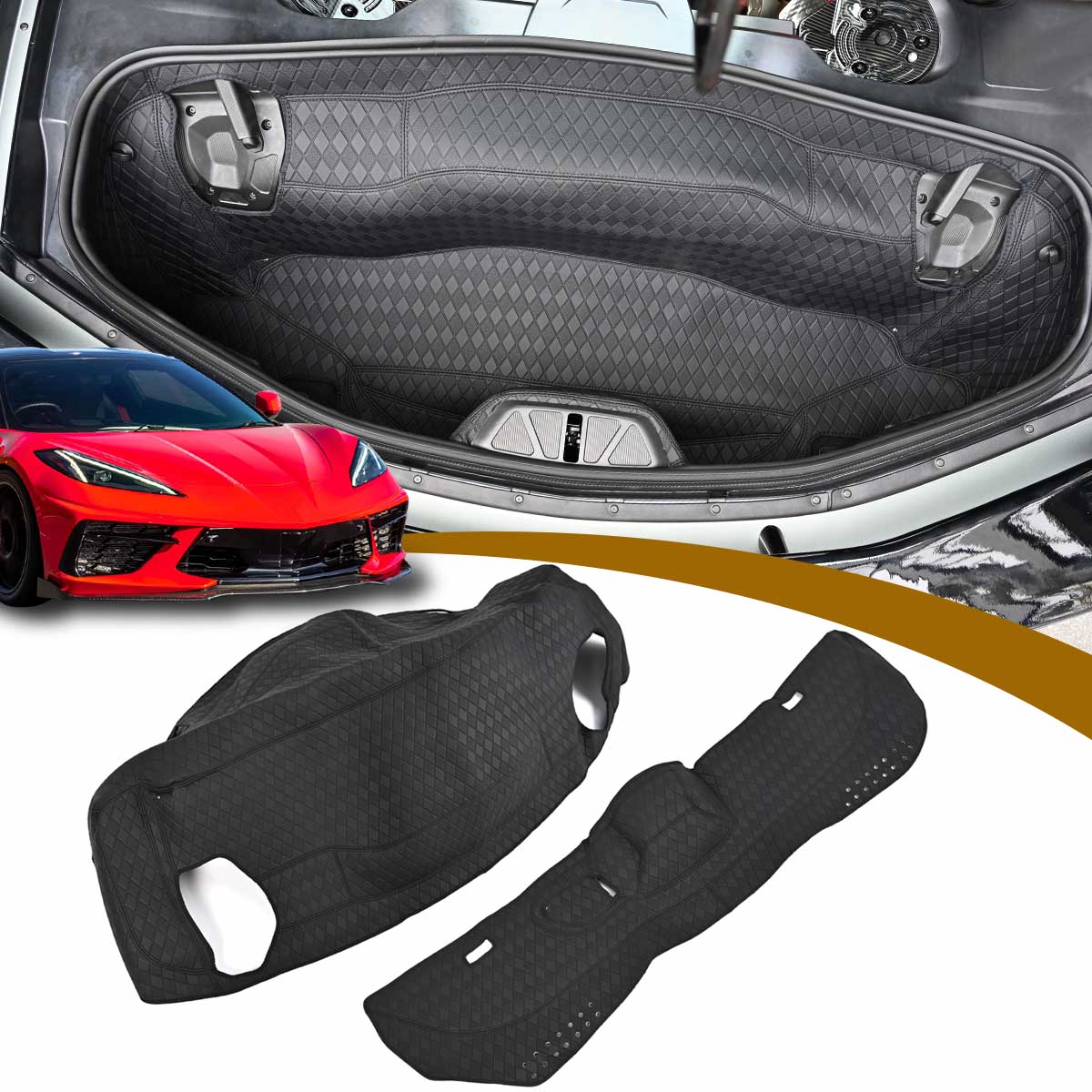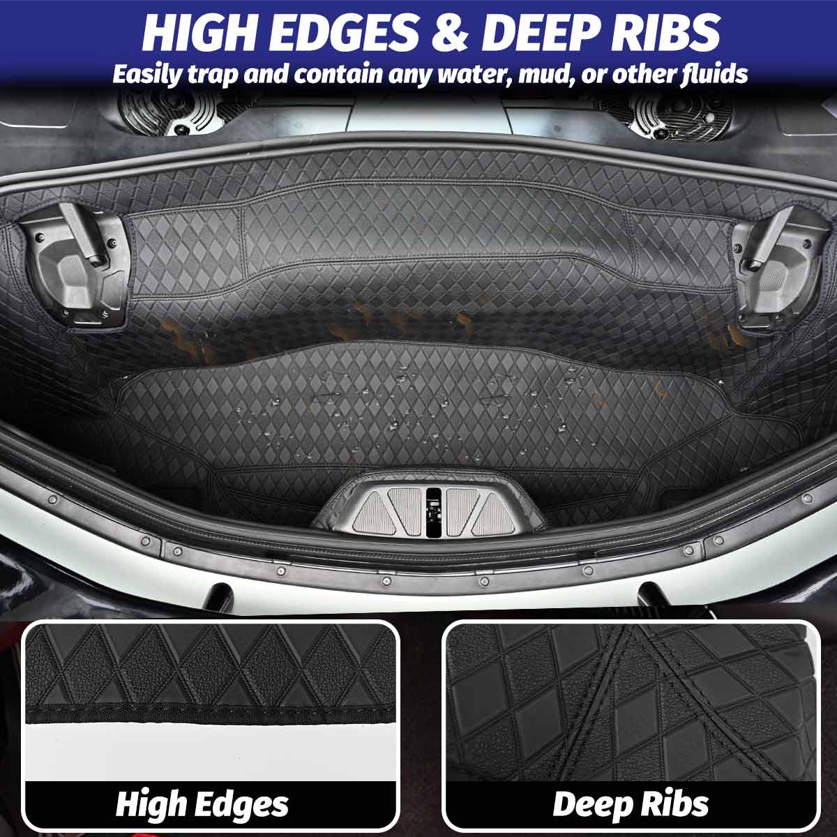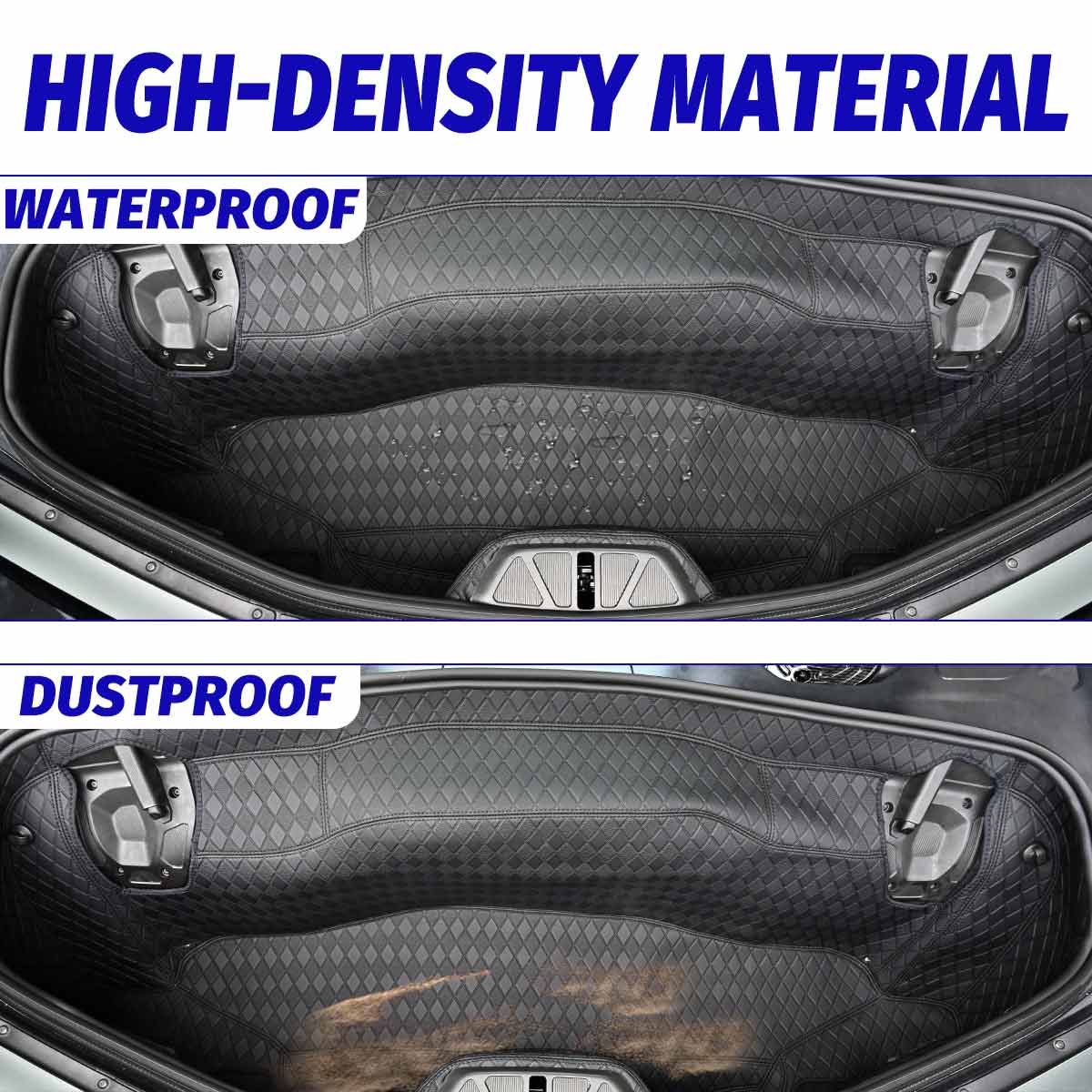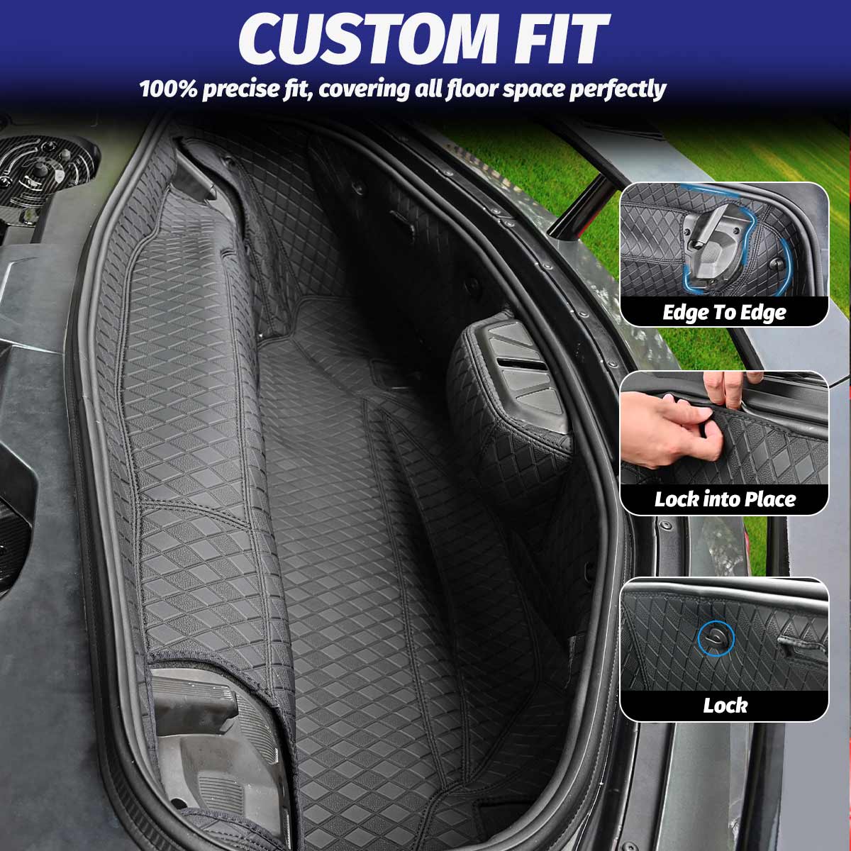 • The rear trunk mats for Corvette save you time vacuuming the C8 Highland and dry quickly after rinsing. Reinforced back bone grip nicely and fit the car snugly, so there's no need to worry about sliding when your car turn sharply,easy to clean,the unique superb craftwork and out-looking liner design with superb skills. This trunk mat is easy to decontaminate to clean and small dust can be wiped with towel, while clay can be washed with a high water gun.