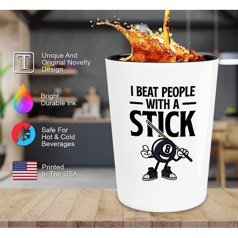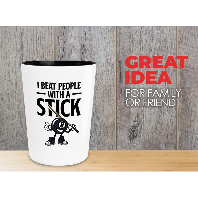Billiard Shot Glass 1.5oz - I Beat People With A Stick - Billiard Lovers Pool Play Hobby Snooker Sport Table Athletics Gaming Coach
