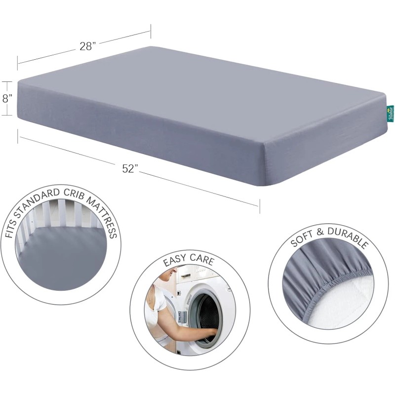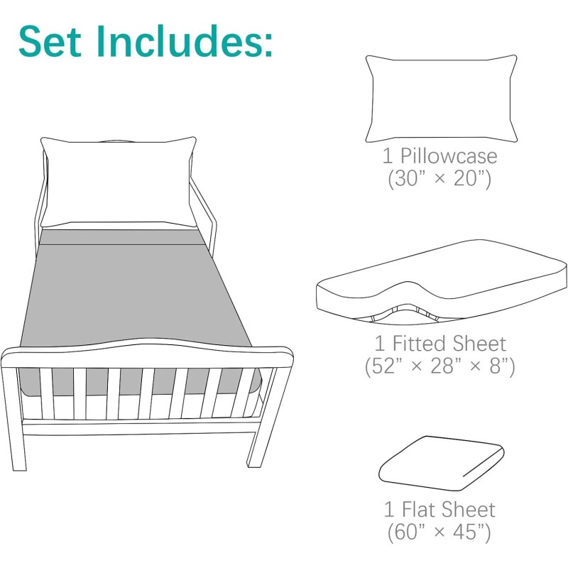 - 3 Piece Toddler Sheet Set: 1 Fitted Sheet (52’’ X 28’’ X 8’’), 1 Flat Sheet(45’’ x 60’’) and 1 Pillowcase(20’’ x 30’’). Our toddler sheet set fits toddler bed or standard crib perfectly. Encased with elastic band around 4 edges, does not slip away when baby’s sleeping over it. Super Soft and cozy texture offers toddlers and babies a good sleep and daily rest.