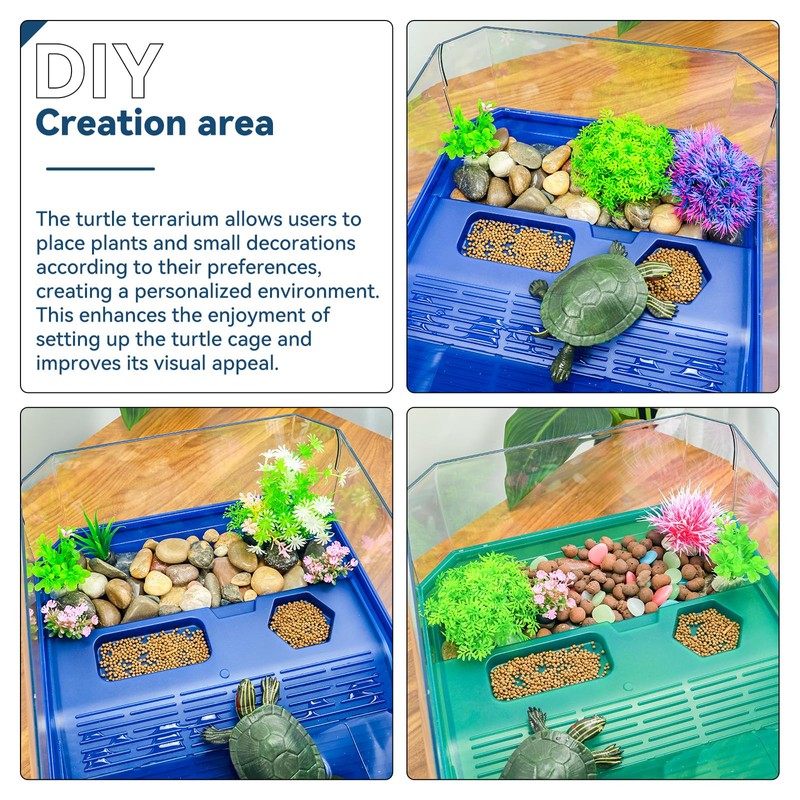 - 【DIY Creative Zone】 The turtle terrarium allows users to place plants and small decorations according to their preferences, creating a personalized environment. This enhances the enjoyment of setting up the turtle cage and improves its visual appeal.