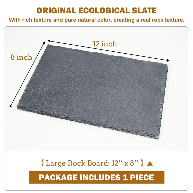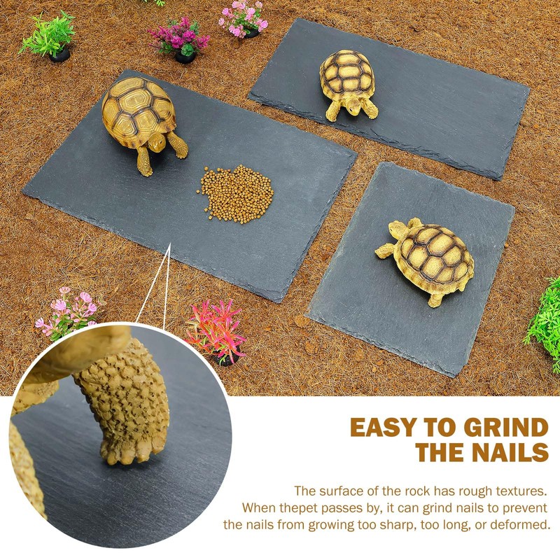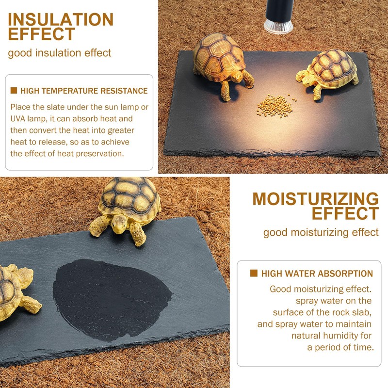 **【Package includes 1 piece】** rock slab×1 **【Introduction to Appearance】** 1\. Original ecological rock slab, rough surface texture, natural fall off the edges to highlight the real texture, imitating the real wilderness scene, let the reptile live in a familiar environment! 2.Four non-slip mats on the bottom of each slab, with non-slip effect. **【Material Advantages】** Original rock slabs have a rich texture and create a real rock feel, which has no advantages over other common tile materials. 1.The slate is hard, pure natural color and can simulate the living environment of nature. 2\. It has the advantages of high temperature resistance, high water absorption rate, good heat preservation and moisturizing effect. 3\. Natural, non-toxic and harmless, can be used as a natural food bowl. **【Material Characteristics】** 1.Moisturizing effect: pour water on the surface of the slate, the spray can keep the natural humidity for a period of time. 2\. Thermal insulation effect: the slate is placed in the sun or UVA lamp, which can absorb heat and then convert the heat into greater heat release, thus achieving the thermal insulation effect. **【Size Selection】** Two rock slab options:Large rock slabs and small rock slabs in different sizes and specifications can be purchased according to actual needs. Sizes: 1\. Large rock slab (12lin*8lin) 2\. Small rock slab (12in*6lin) **【Suitable species】** turtles, chameleons, lizards, and other reptiles. **【How to Use】** 1\. The surface of the rocks has a rough texture, so when your reptile passes by, you can grind your nails to prevent them from growing too sharp, too long, or too deformed, which is a guarantee of your reptile's health. 2\. It can be used as a food bowl, where various kinds of food can be placed and eaten by crawling pets when they pass by.