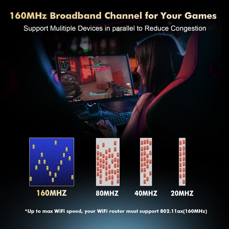 - 6 GHz band: Say goodbye to the overload of the WiFi signal with 6 GHz band. 160MHz wider channel and faster data throughput make it perfect for high bandwidth applications such as NAS, gaming, 8K HD video, make full use of the power of the WIFI6E router. **Windows 11 or upgrade to Windows 10 Dev Version 64-bit**
