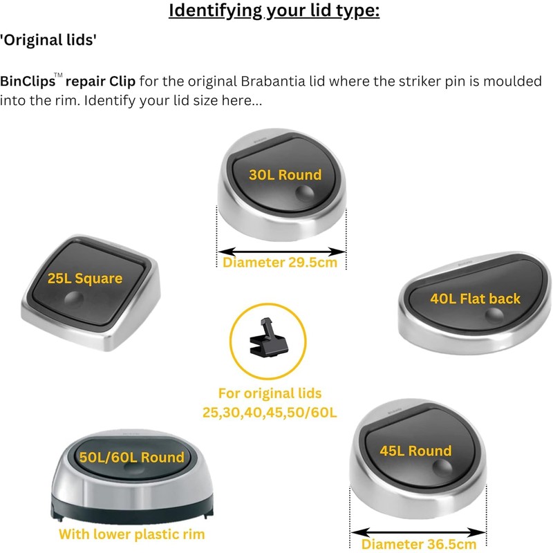 - Repair clip for original Brabantia Touch bin lid, where pin is moulded into the rim. You may receive 2 variants depending on which bin you have - only one will fit.