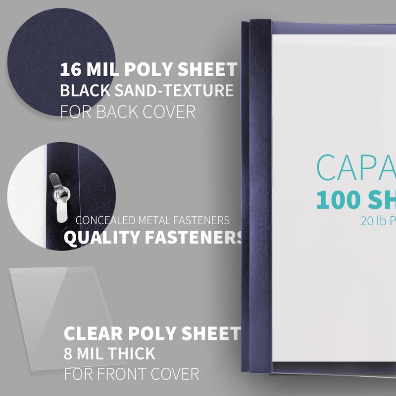 - Clear Front Cover: The clear report covers are made from 8mil (0.2mm) Polypropylene material, allowing you to easily display your customizable title page and find the required documents quickly.