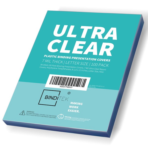 Binditek 100 Pack 7 Mil Binding Presentation Covers, Ultra Clear, 8.5 x 11 Inches, Letter Size, Square Corners, Un-Punched