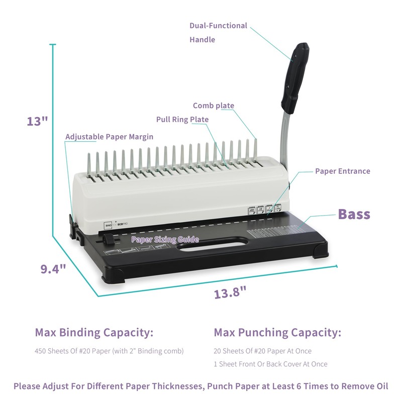 • 【Punching Capacity of 12 Sheets & Binding Capacity of 450 Sheets】The comb binding machine can bind up to 450 sheets using 2" plastic binding combs. It can manually punches up to 12 sheets at a once without any misaligned holes or burrs. Attention: The values provided above are based on testing with #20 paper. If you use paper of other thickness, please adjust accordingly!