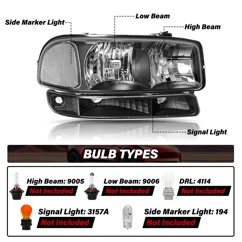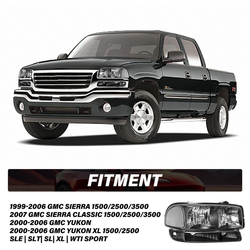• 【VEHICLE COMPATIBILITY】Headlights Assembly Fit for 99-07 GMC Sierra 1500, 01-07 GMC Sierra 1500HD 2500HD 3500HD, 99-04 GMC Sierra 2500, 99-06 GMC Yukon, 00-06 GMC Yukon XL 1500 2500, 01 Sierra C3. Does NOT Fit All Denali Trims. For 2007, Fits Classic Models ONLY. High beam bulb type: 9005(NOT INCLUDED); Low beam bulb type: 9006(NOT INCLUDED); Turn Signal: 3157A(NOT INCLUDED); Side Marker Light: 194(NOT INCLUDED); DRL: 4114(NOT INCLUDED).