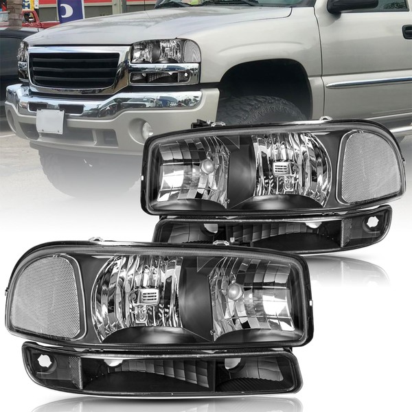 Bingbingmotor BRYGHT 4PCS Headlight Assembly for 1999-2006 GMC Sierra 1500 2500HD 3500HD Front Light 99-06 Yukon 00-06 Yukon XL 1500 2500 Replacement Pair Set Black & Clear 【NOT Fit Denali Model】