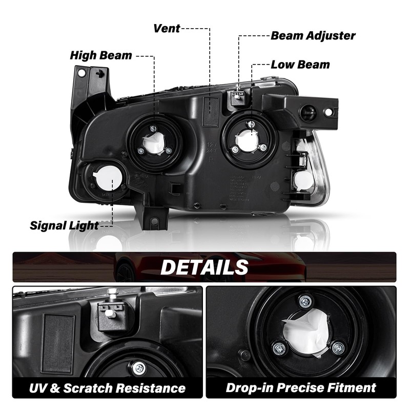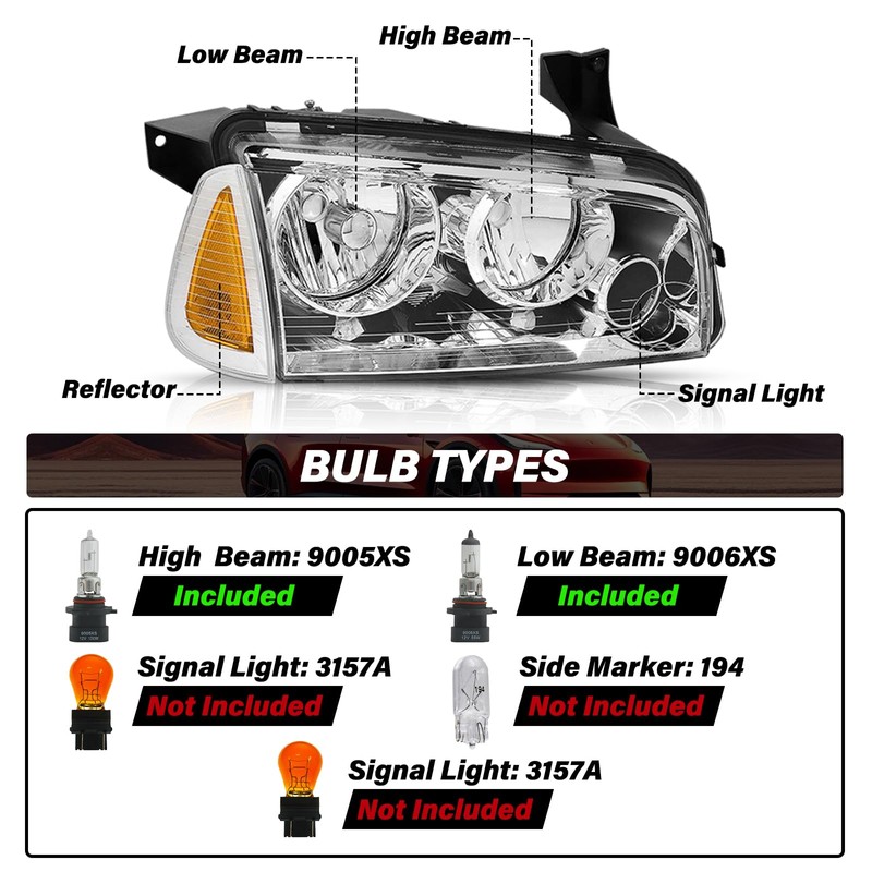 - 【VEHICLE COMPATIBILITY】Headlights Assembly Compatible With 2006-2010 Dodge Charger Headlight with Corner Light. High/Low Beam Bulbs are included. High beam bulb type: 9005XS; Low beam bulb type: 9006XS;Signal light:3157A.
