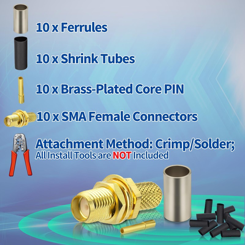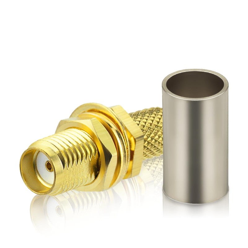 - SMA Female Bulkhead Mount Crimp Solder Connector; Compatible with RG58 RG303 RG141 RG142 RG400 Low Loss 195 Coaxial Cable;