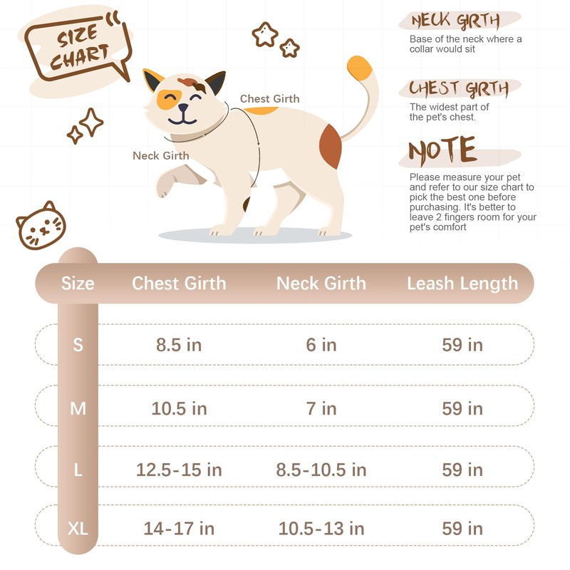 - 🍊[SIZE Large]: Neck girth 8.5-10.5 in, Chest girth 11-15 in, Leash Length 59 in. Please measure your pet’s size carefully before buying.