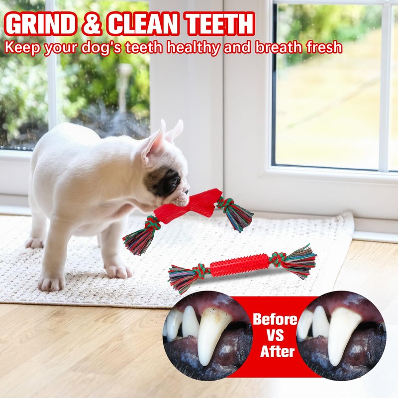 - FUN DOG TEETHING TOYS: These dog chew toys effectively assist dogs in cleaning their teeth and help puppies teething while promoting healthy chewing habits. The wear-resistant, tightly woven twist and sturdy knot make the puppy teething toy stand up to intense chewing, and the fibers of the cotton rope can gently clean between the dog's teeth without harming them or irritating their gums. Additionally, the combination of ample rubber ropes provides deep massage to maintain dog's oral health.