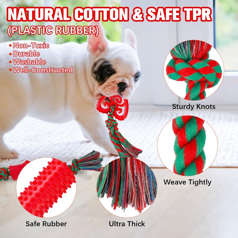 - RICH & ATTRACTIVE DOG TOY PACK: The dog toy set consists of 8 dog rope toys in various shapes, making it ideal for puppies as well as small and medium-sized dogs. The vibrant Christmas-style colored cotton ropes combined with rubber toys of diverse sizes and forms will capture your puppy's attention instantly. These enriching dog toys make wonderful gifts for your furry friends, whether for daily play or festive Christmas decorations.