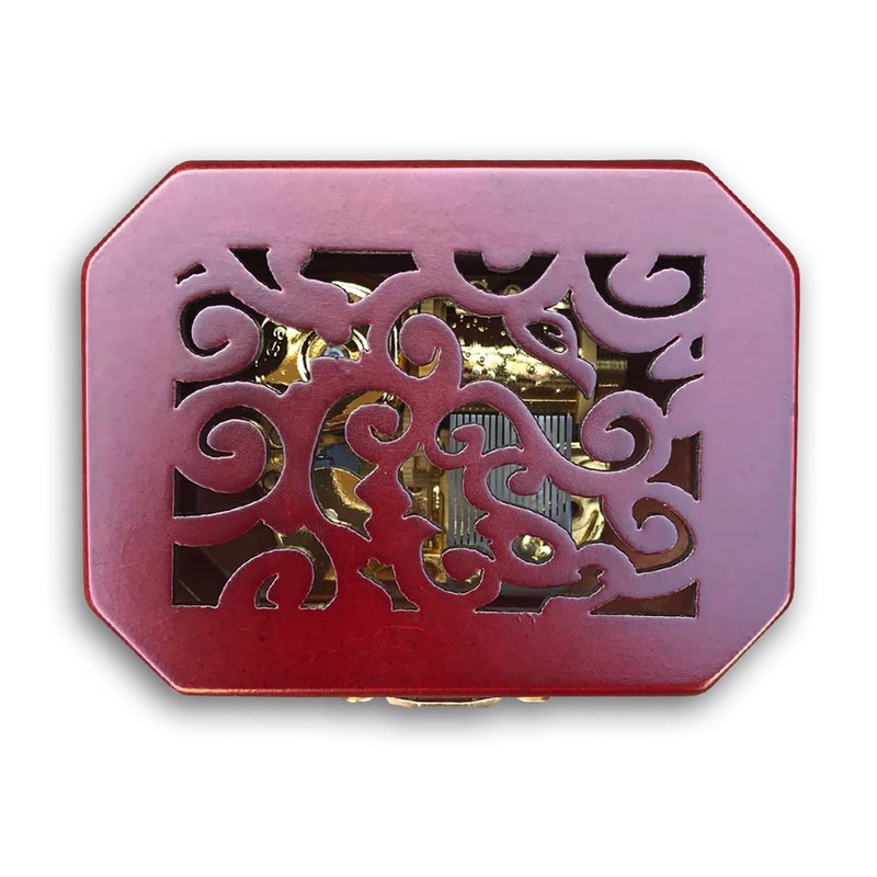 1. This music box has a hollow out cover and it is made of wood. Also, there is a lock catch for the cover, that makes the cover close better.
