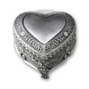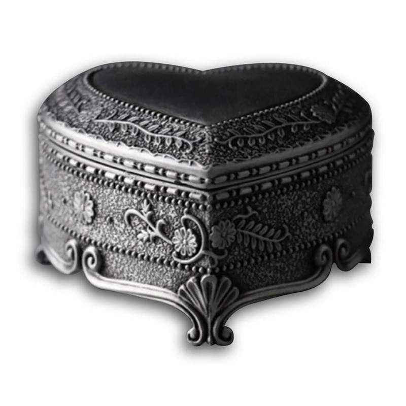 - Tin alloy heart-shaped Sankyo clockwork music box with black sponge interior.