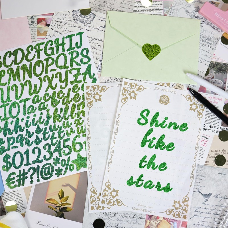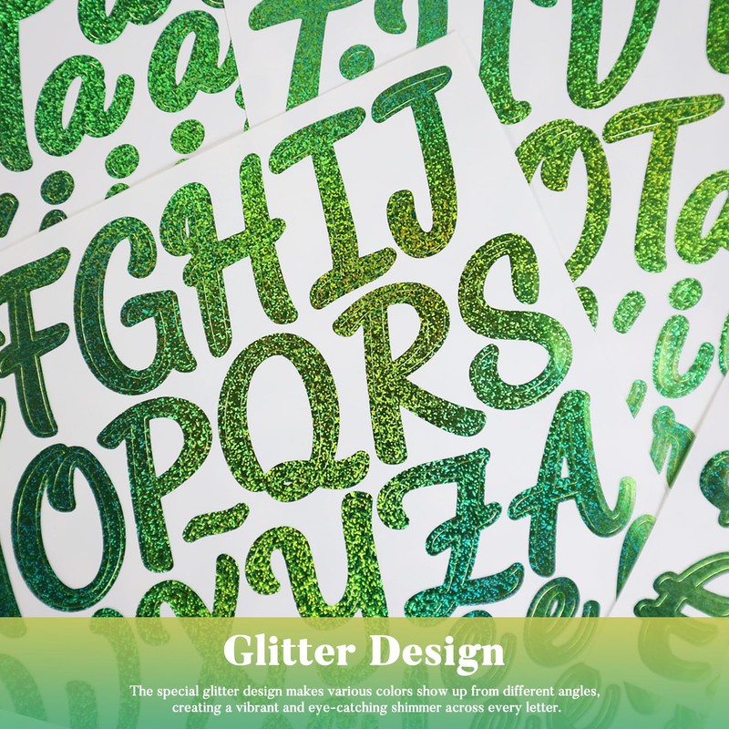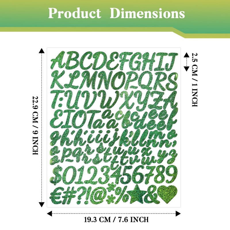 - Green Letters and Numbers: This set includes 10 sheets of gold glittering vinyl letter and number stickers, with each sheet containing capital letters, lowercase letters, numbers, and symbols.