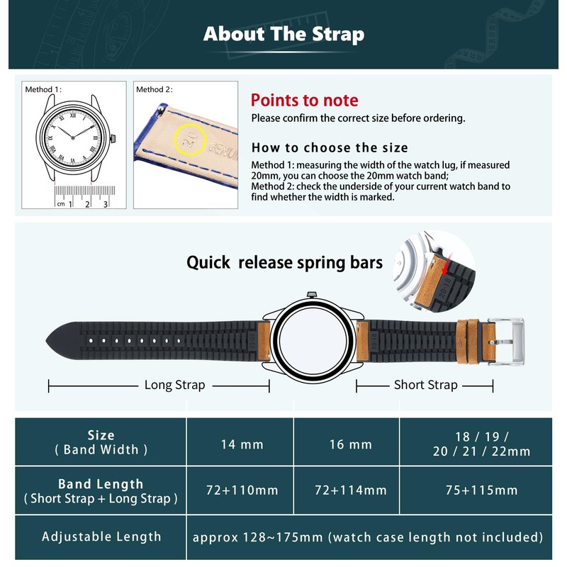 - 【Quick Release Watch Band】14mm leather watch band fit wrists between 5.04-6.88inch (128-175mm, watch case length not included). Equipped with stainless steel pin buckle, help you adjust to a suitable strap length easily. Upgraded quick release spring bars allow you to change strap in seconds.
