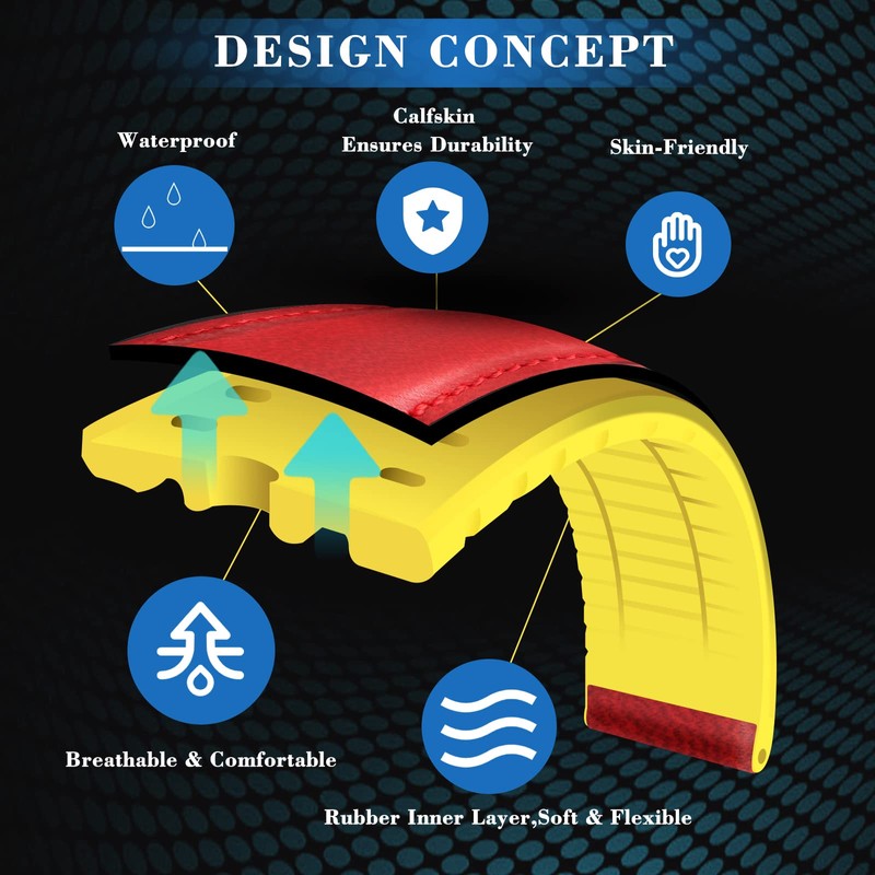 - 【Caring and Unique Hybrid Design】Prevent leather watch band sticking to skin when hot day, the back of watch band combines silicone rubber. Caring breathable groove design leaves breathing room to your skin, reduces band weight and improves your wearing experience.