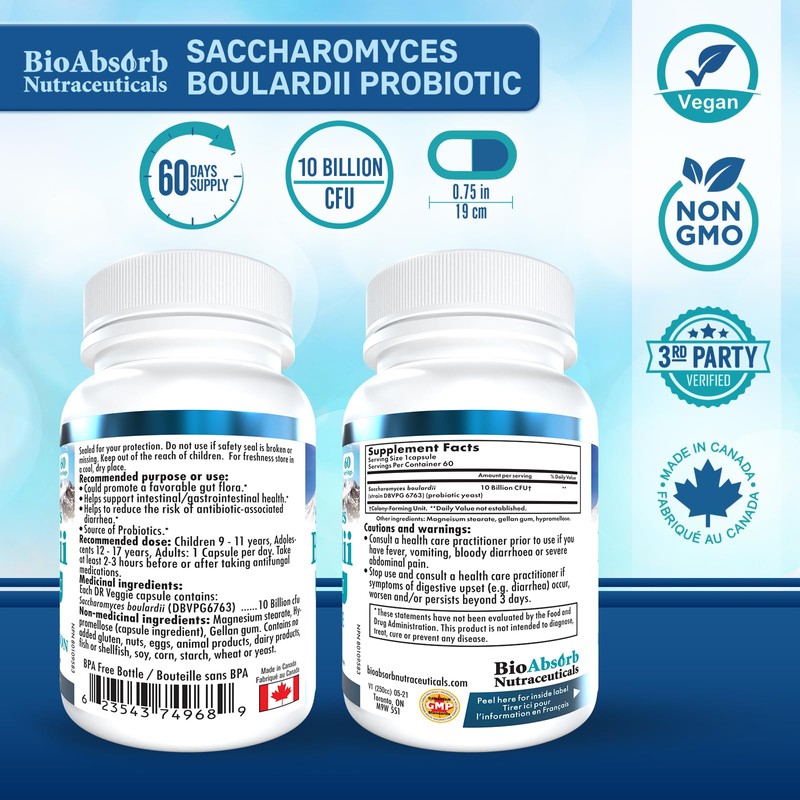 Bio Absorb Nutraceuticals Saccharomyces Boulardii Probiotic. 10 Billion CFU of S Boulardii. 60-Day Supply. Shelf-Stable, Vegan (60 Capsules)