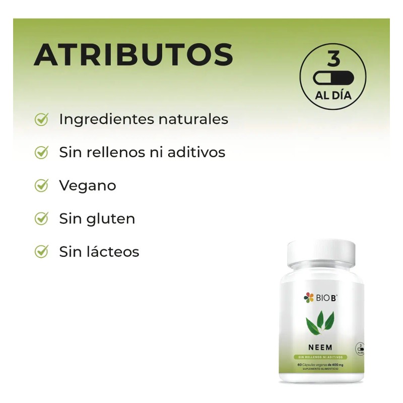 - Tipo de envase: Frasco con 60 cápsulas vegetales de Hoja de Neem en polvo.