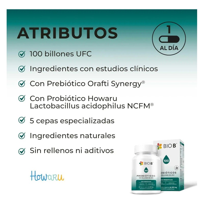 BIO B ǀ Probióticos con 100 Billones UFC + Prebióticos ǀ 30 Cápsulas Veganas