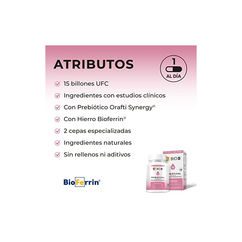 - 30 cápsulas vegetales de Probióticos con 15 billones UFC y Hierro Bioferrin de 400mg